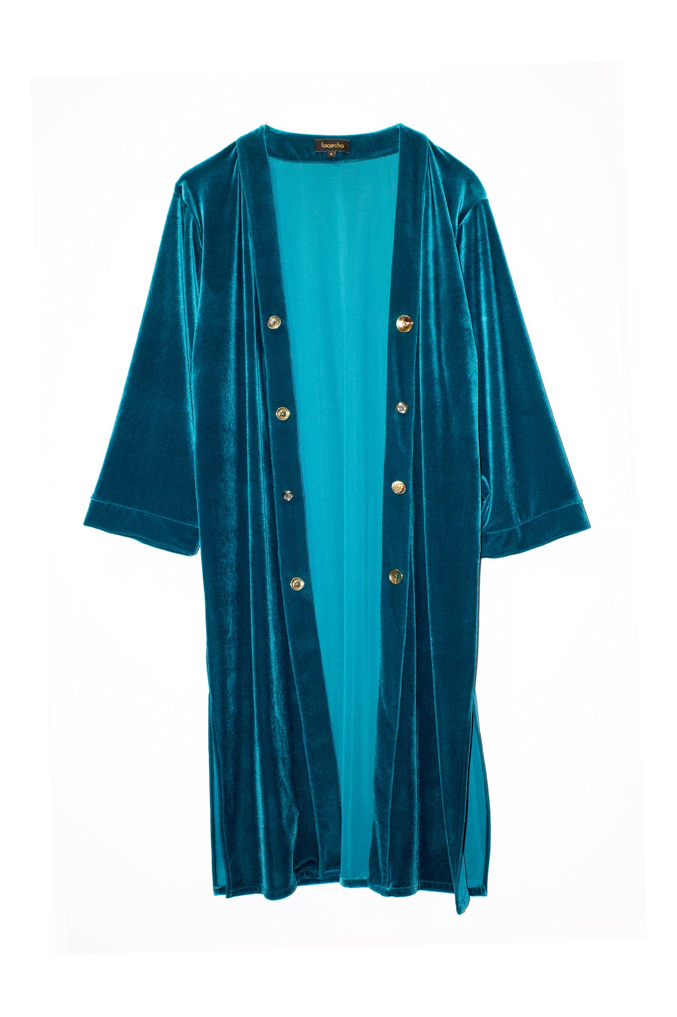 Chaqueta terciopelo larga adornada con bonitos botones joya. Corte holgado, manga larga con hombros caídos y aberturas laterales.